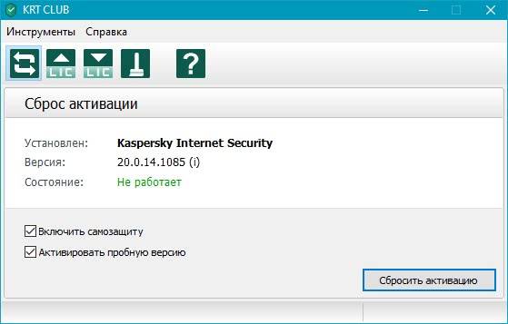 Описание: KRT CLUB - программа для сброса триала (для многократного использования пробного периода активации), сохранение лицензии, активация ранее сохранённой лицензии антивирусных продуктов Kaspersky.