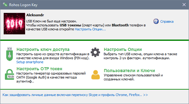 Rohos Logon Key хранит на USB накопителе (Ключ) до 64 login профайлов для авторизации на любой персональный компьютер или сетевой ПК (где установлена программа).