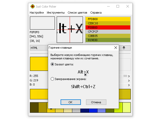 Определяемые пользователем клавиш для захвата кода цвета (Alt + X по умолчанию).