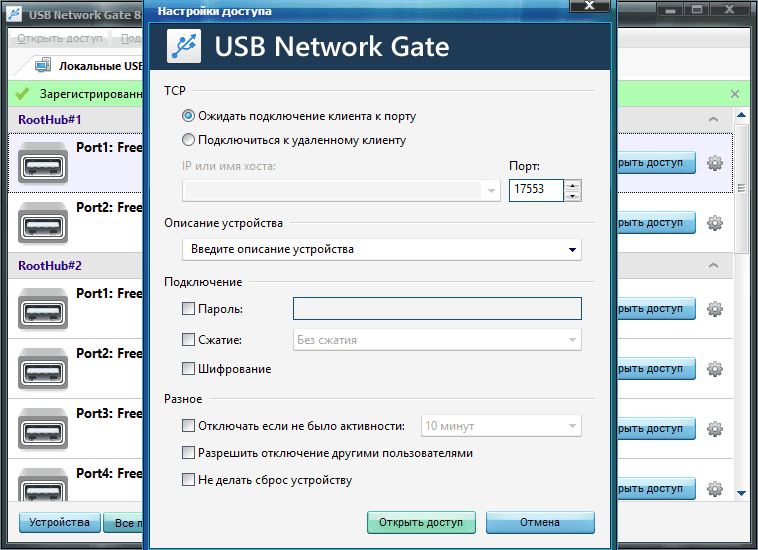 USB Network Gate (бывший USB to Ethernet Connector) легко подключает одно или несколько удаленных USB-устройств к вашему компьютеру по сети Ethernet (Интернет/LAN/WAN) так, словно они подключены к системе напрямую. Не имеет значения, находитесь ли вы в другой стране или соседнем офисе, вы всегда можете воспользоваться удаленным сканером, принтером, веб-камерой, модемом, USB-донглом и любым другим оборудованием, как будто они подключены непосредственно к вашему ПК. Программа поможет вам открыть доступ к USB устройству по сети Ethernet для нескольких компьютеров так, чтобы люди со всего мира (или вашего офиса) могли его использовать. Вы сможете получить доступ к принтеру, сканеру, веб-камере, USB-донглу или любому другому поддерживаемому USB-устройству с вашего домашнего ПК или офисного ноутбука в любом месте, в любое время! USB Network Gate дает вам уникальную возможность совместного использования USB-устройства на Windows PC или Mac OS и подключения к нему с устройства на базе Linux. Или наоборот!