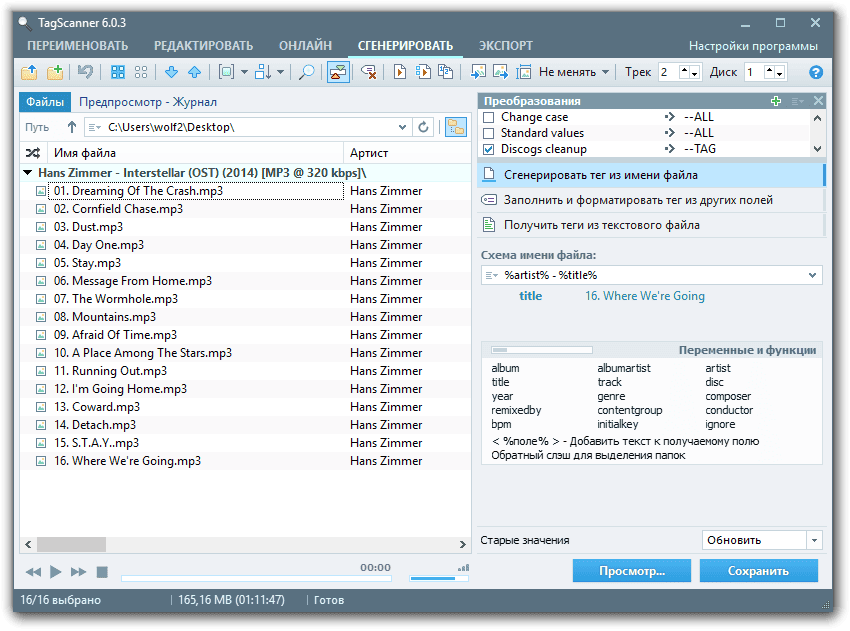 ✓ Переименование музыкальных файлов по информации из ТЭГов