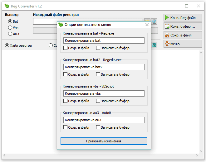 Портативная бесплатная утилита для конвертирования файлов реестра (.reg) в пакетные .bat -файлы или .vbs, .au3. -скрипты. Пригодится для создания «тихих инсталляторов», внесения заранее подготовленных настроек в программу и т.д.
