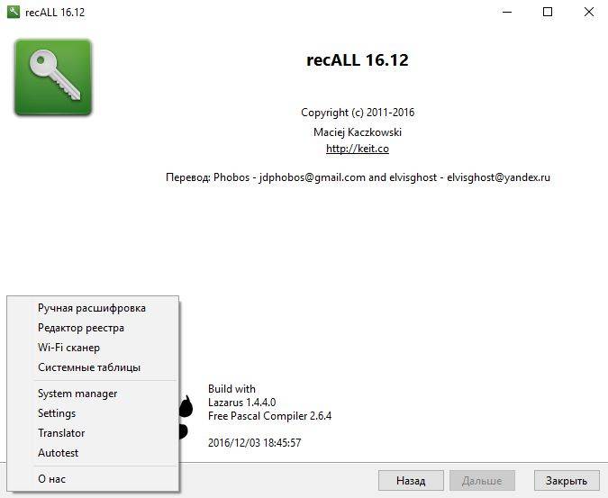 recALL - бесплатная, простая и лёгкая в использовании программа, которая может помочь Вам вернуть потерянные пароли, которые используются для доступа к различным программам и даже учётным записям. Позволяет быстро восстановить пароли к более чем 270 программам (почтовые клиенты, веб-браузеры, мессенджеры, FTP-клиенты, Wi-Fi и т.д.) и лицензионные ключи к более чем 2800 приложений. Это программа, которая позволяет восстанавливать большинство паролей и лицензий также с повреждённых операционных систем.
