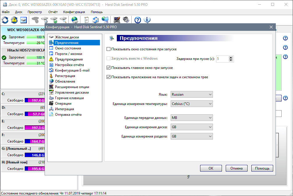 выводятся сведения по всем разделам в системе, независимо от количества накопителей; в дальнейшем эти данные используются для автоматического предупреждения и отображения статуса;
