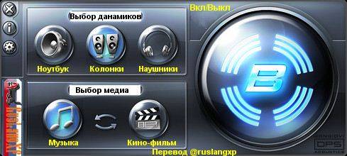 DPS оптимизирует звучание, для трех типов динамиков: Встроенные ноутбук, Колонки, Наушники, и под вашу среду прослушивания — Музыка, Кино.