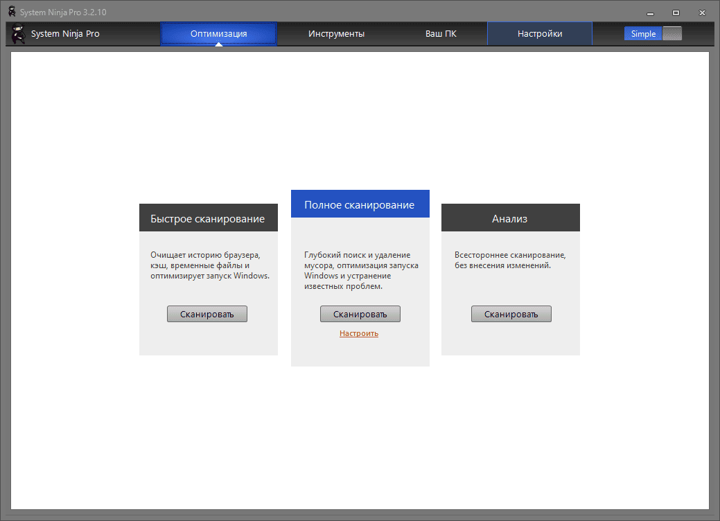 Описание: System Ninja - быстрое и эффективное решение для оптимизации компьютера под управлением ОС Microsoft Windows. Утилита предназначена для быстрого и аккуратного удаления разнообразного файлового "мусора" с жесткого диска, повышения скорости системы и устранения проблем. Одна из особенностей - поиск "мусора" не в определенных местах, а по всей файловой системе. После сканирования выдается подробный отчет со всеми деталями для того, чтобы пользователь мог собственноручно решить дальнейшую судьбу каждого файла. Удобный интерфейс упрощает настройку параметров сканирования. В состав приложения включены различные полезные инструменты (Менеджер автозапуска, Деинсталлятор, Менеджер процессов, Поиск дубликатов и др.).