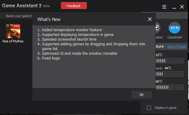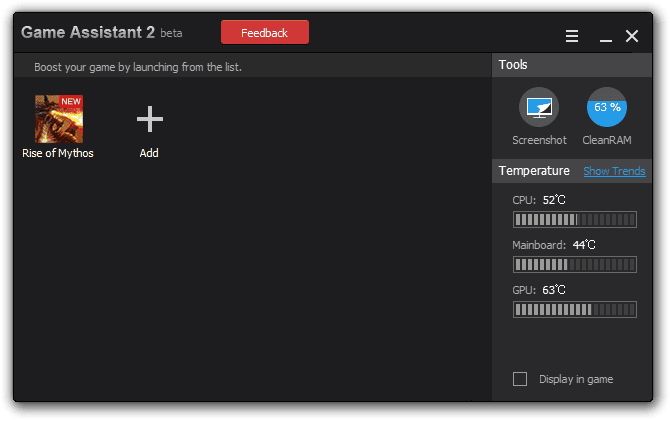 Описание: Game Assistant 2 является свободным, легким и простым в использовании инструментом для помощи в контроле и ускорении работы ПК, даже когда вы находитесь в игре. В целях защиты игрового ПК, особенно ноутбуков от повреждений оборудования, вызванных высокой температурой, Game Assistant 2 обеспечивает температурный мониторинг, чтобы показать вам температуру процессора, материнской платы, графического процессора и скорость вращения вентилятора в режиме реального времени. Более того, он также может работать без каких-либо проблем в вашем игровом окне. Когда температура выше положенного, сигнал будет информировать Вас о том, что нужно принять меры для защиты вашего ПК. Кроме того, если вы обнаружите, что ваш компьютер замедляется высоким потреблением оперативной памяти, вы можете легко очистить её всего одним кликом.