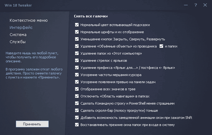 Win 10 Tweaker — это небольшая, но очень мощная программа, позволяющая сделать полную оптимизацию Windows 10 в несколько кликов. Не пускает пыль в глаза бесполезными настройками, а каждый пункт содержит подробную подсказку-описание. Любое действие выполняется без внешних модулей, средствами самой программы и возможностями Windows, поэтому антивирусы не ругаются на Win 10 Tweaker.